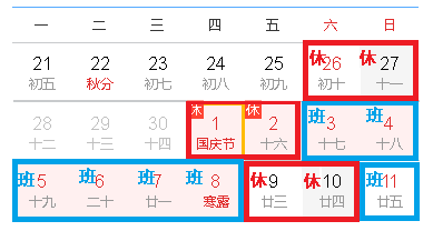 10月1日、2日放假2天;10月3日至10月8日照常上课(其中,3日、4日分别上周四、周五的课程);10月9日、10日调休2天,10月11日照常上课(上周五课程)。