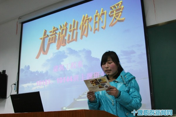此次活动是响应《十堰晚报》等十家媒体为庆祝三八国际妇女节而发起的“大声说出你的爱”大型公益活动。建筑工程系党总支副书记王厚兵在活动开始前,带领大家回顾了各自寒假里为父母所做的事,进行了“你所了解的父母”问卷调查,并算了一笔“读书账”。随后向在座的同学发放了感恩亲情明信片,同学们纷纷拿出手中的笔,在明信片上写下了自己要对父母说的话,并准备把它寄给父母。在王老师的提议下,大家踊跃上台说出了自己对父母的愧疚以及他们对父母的承诺。同学们还集体朗诵了《学会感激》诗篇,最后在大家合唱的《感恩的心》动人旋律中落下了帷幕。