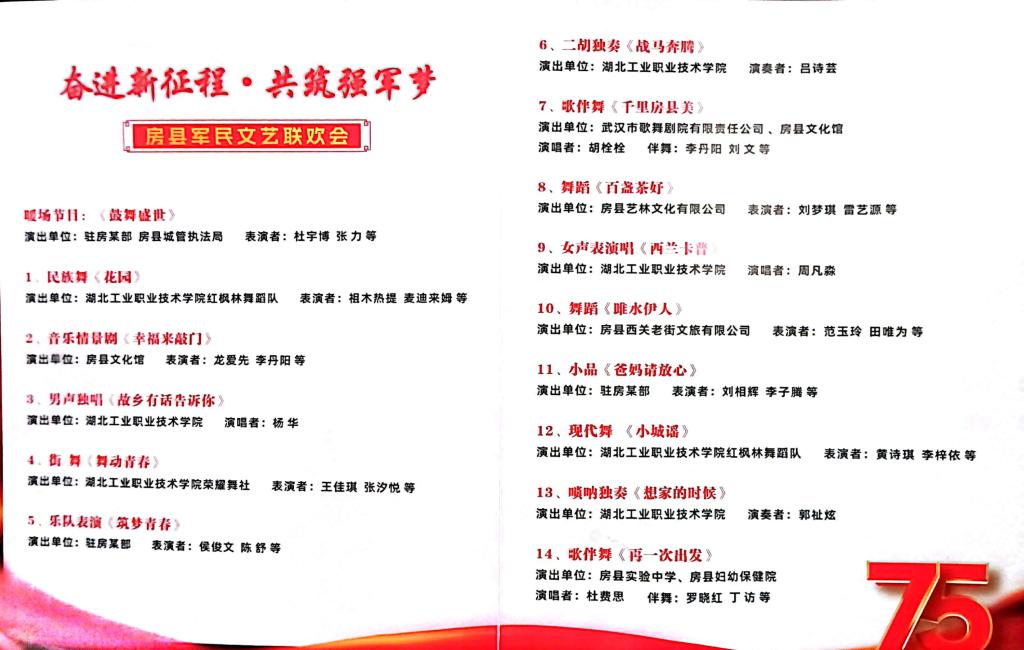 新闻网讯(文/新华歌 图/顾荣昊)9月28日,应十堰市房县文化和旅游局邀请,开云英超官网_开云online(中国)大学生艺术团7个节目参加该县庆祝新中国成立75周年大型军民文艺汇演,得到现场一致好评。进一步突显了我校在学生音乐舞蹈素质拓展教育方面的长足进步。