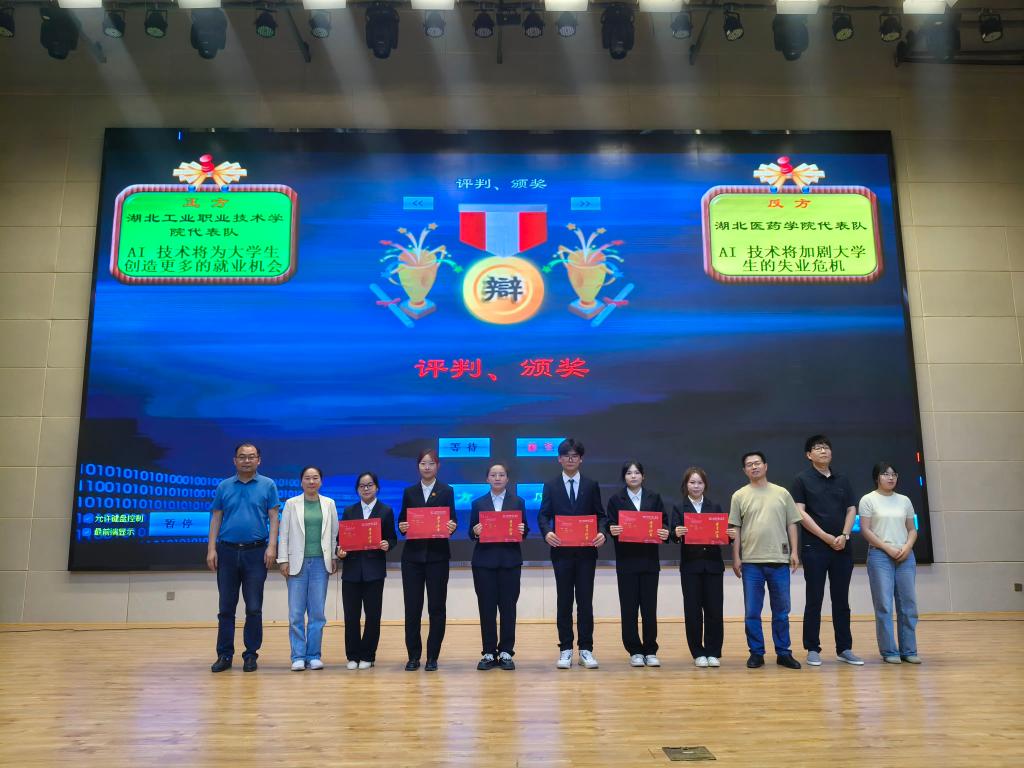 黄镜潮老师在点评中肯定了双方在论据建构、临场应变上的亮点,他指出,辩论赛不仅是语言的较量,更是思维的锤炼,此次辩论引导大家以更理性的态度对待AI带来的机遇与挑战。最终,我校四辩张浩同学、湖北医药学院二辩刘雅芸同学凭借出色的表现荣获“最佳辩手”荣誉,其他参赛选手获“优秀辩手”。
